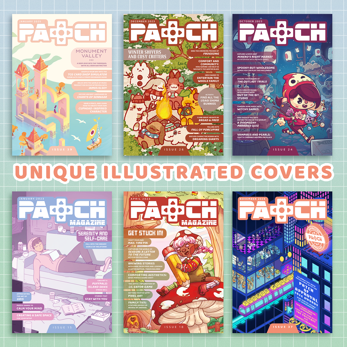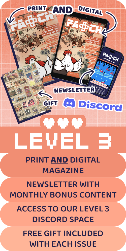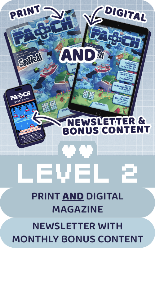 Patch is a small-but-mighty magazine that is all about the wonderful world of indie games. But when we started, we didn't just want to put words on paper. We saw traditional media and took on a challenge: to create a tangible magazine that is as immersive, interactive, and fun as the games we play!
